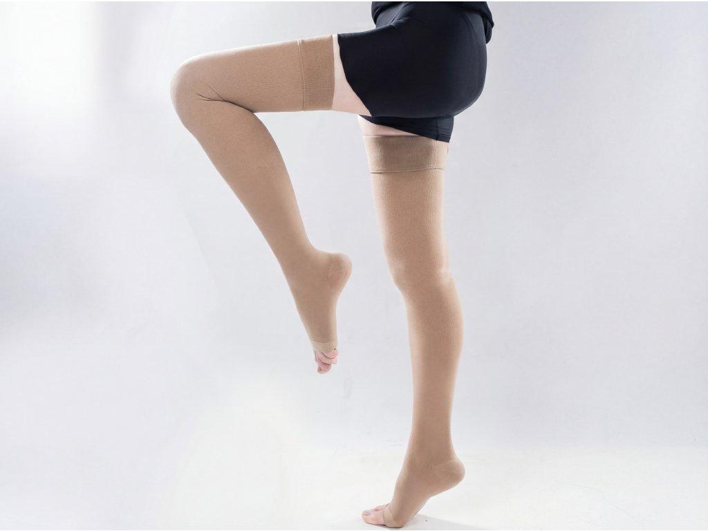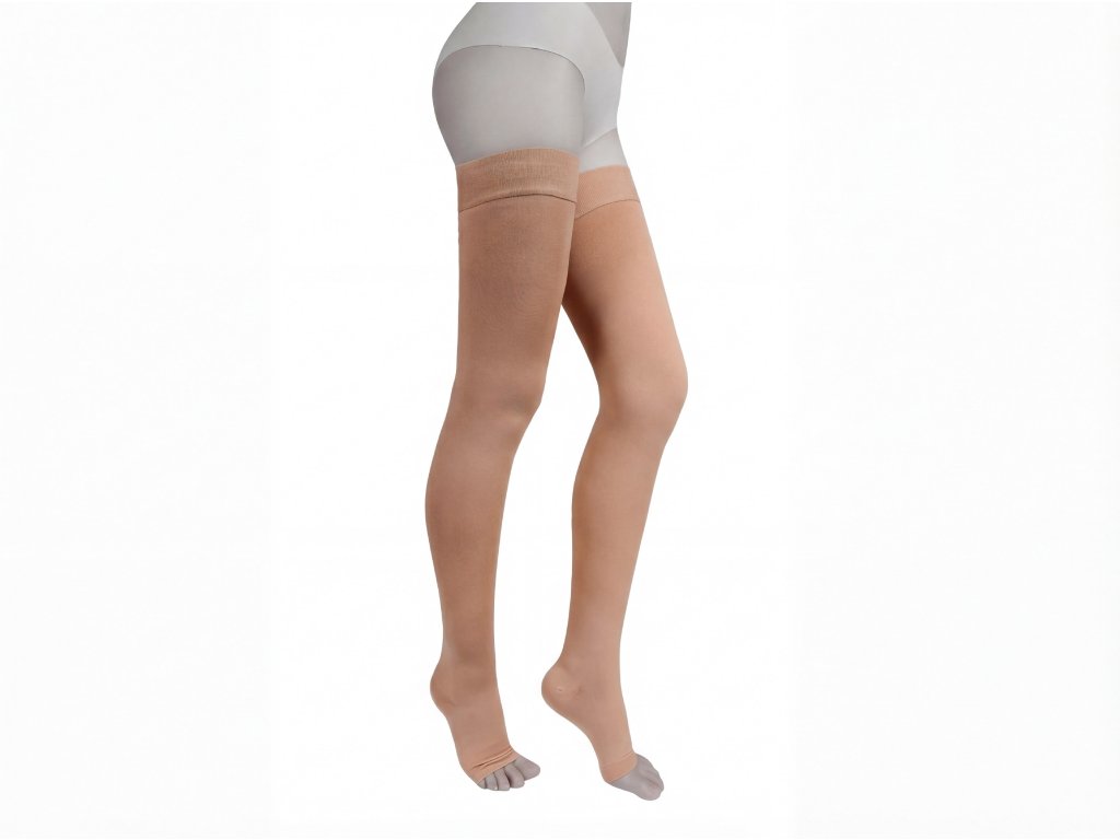 Tyto medicínské kompresní punčochy do stehen (thigh high) jsou navrženy pro podporu žilního oběhu, prevenci hluboké žilní trombózy a zmírnění příznaků varixů na dolních končetinách. Ideální jako doplňková léčba pro osoby trpící varixy, otoky nebo pro prevenci po operacích. Punčochy poskytují graduovanou kompresi, která je nejsilnější v oblasti kotníku a postupně slábne směrem nahoru, což pomáhá zlepšit průtok krve a snížit únavu nohou. Díky bezšvovému designu a silikonovému pásku na stehnech zůstávají na místě bez sklouzávání, zajišťují komfort při chůzi i sportu a neomezují pohyb v koleni. Otevřená špička (open toe) umožňuje lepší ventilaci, snadné nošení s otevřenou obuví a je vhodná pro osoby s citlivými prsty nebo pro teplé počasí.