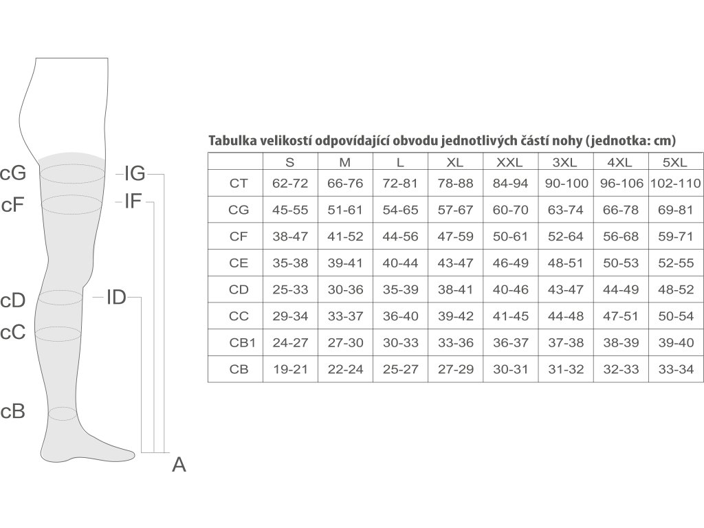 Tabulka velikostí (obvody v cm, podle manuálu): Pro správný výběr změřte obvody v klíčových bodech: cB (kotník), cB1 (nad kotníkem), cC (nejširší část lýtka), cD (pod kolenem), cE (koleno), cF (stehno), cG (nejvyšší část stehna).