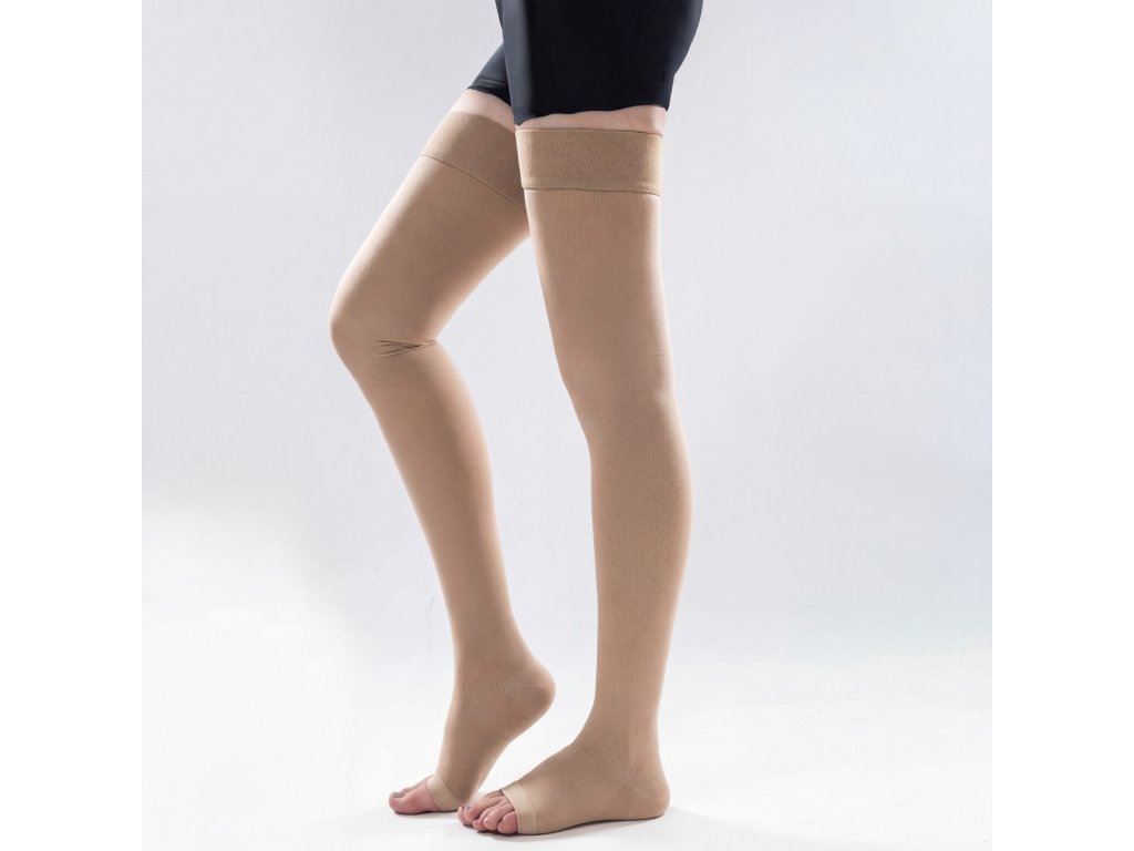 Tyto medicínské kompresní punčochy do stehen (thigh high) jsou navrženy pro podporu žilního oběhu, prevenci hluboké žilní trombózy a zmírnění příznaků varixů na dolních končetinách. Ideální jako doplňková léčba pro osoby trpící varixy, otoky nebo pro prevenci po operacích. Punčochy poskytují graduovanou kompresi, která je nejsilnější v oblasti kotníku a postupně slábne směrem nahoru, což pomáhá zlepšit průtok krve a snížit únavu nohou. Díky bezšvovému designu a silikonovému pásku na stehnech zůstávají na místě bez sklouzávání, zajišťují komfort při chůzi i sportu a neomezují pohyb v koleni. Otevřená špička (open toe) umožňuje lepší ventilaci, snadné nošení s otevřenou obuví a je vhodná pro osoby s citlivými prsty nebo pro teplé počasí.